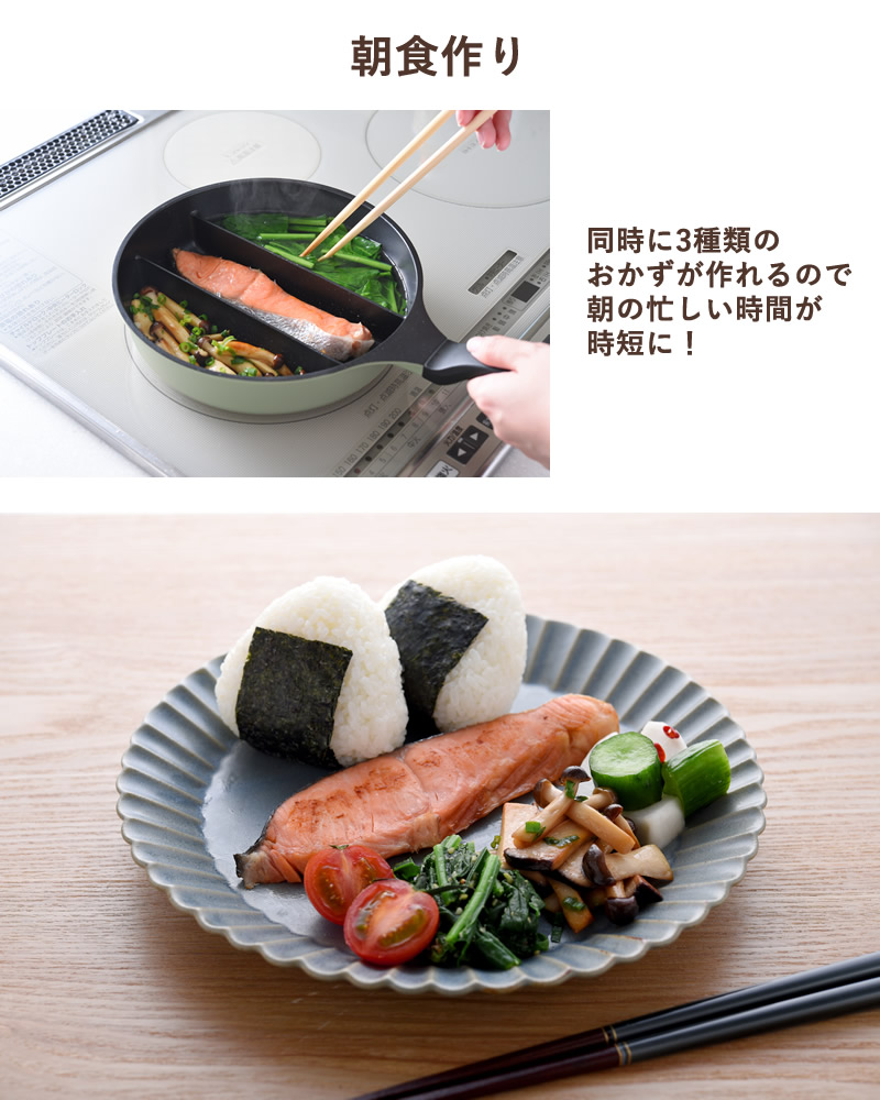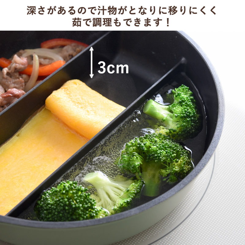 3つの仕切りで同時に調理できるフライパンです。