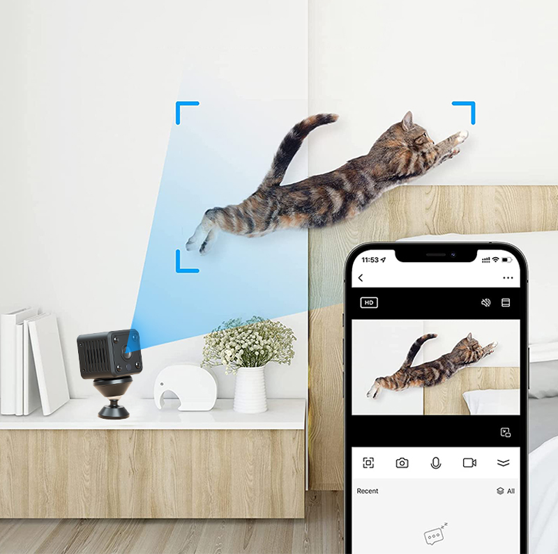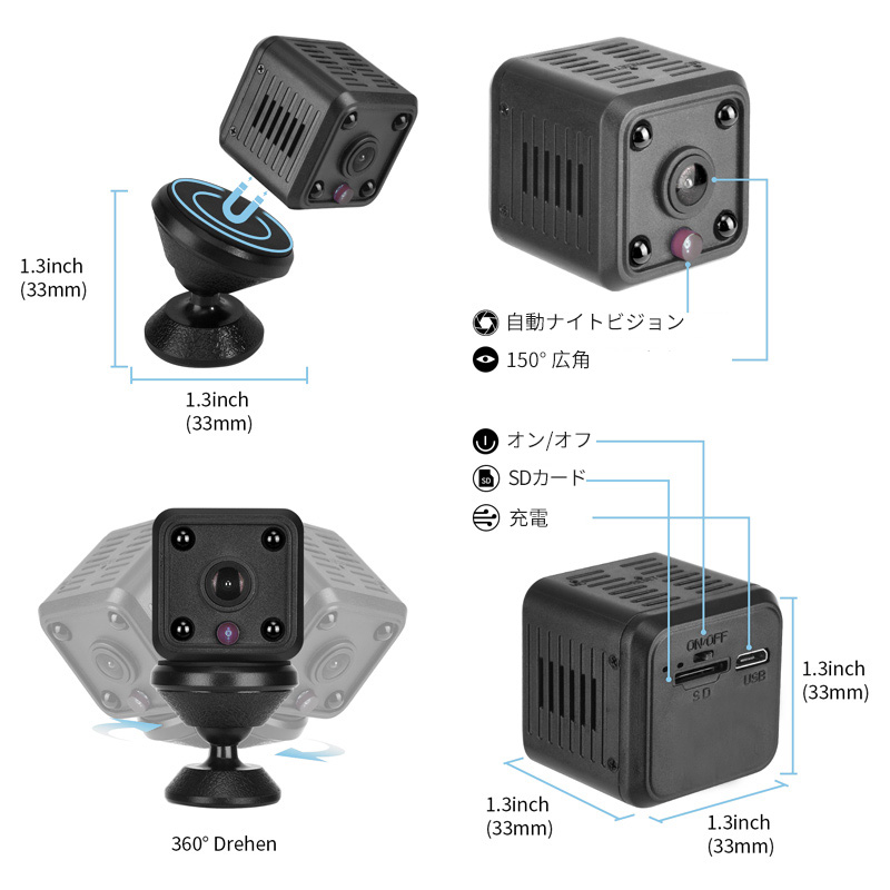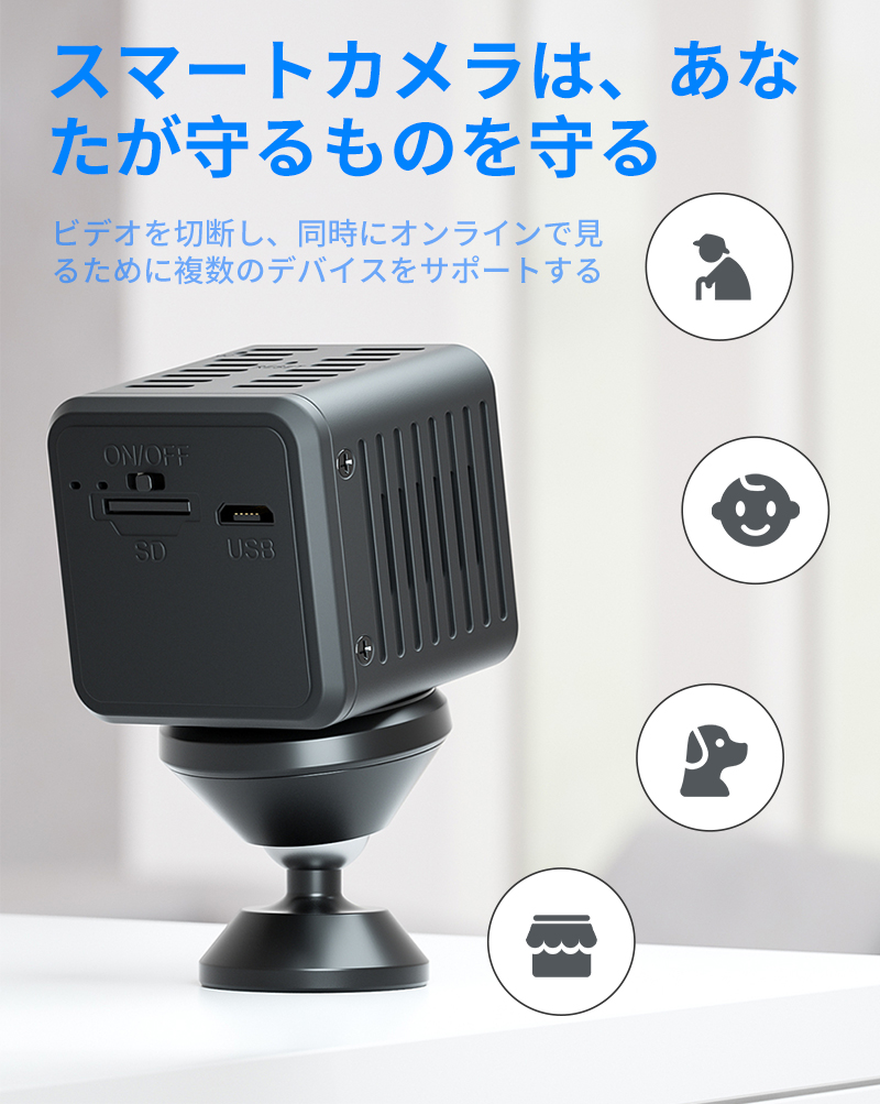 この防犯カメラはコンパクト設計を極め、わずか 3.3cm 四方の小型立方体形状で、重量はたった 85g と超軽量です。サイズは 500 円硬貨とほぼ同じで手のひらに収まるため、本棚の隙間、ソファのすき間、茂った植木の中などに自然に隠せ、隠蔽性に優れています。また、スタンドに強力な両面テープを装備し、本体には強力な磁石を内蔵しているため、机、壁、車内などあらゆる場所に簡単に設置できます。