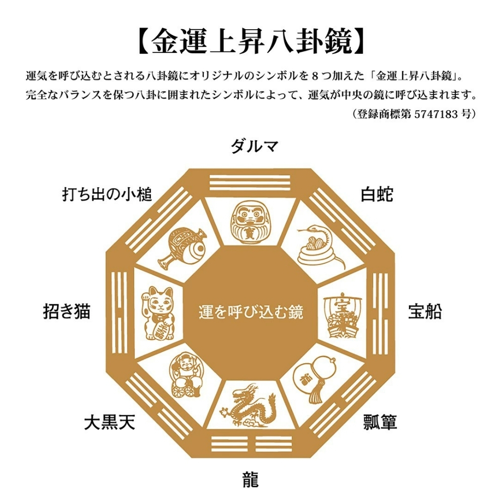 完全なバランスを保つ八卦に囲まれたシンボルによって、運気が中央の鏡に呼び込まれます。(登録商標第5747183号)