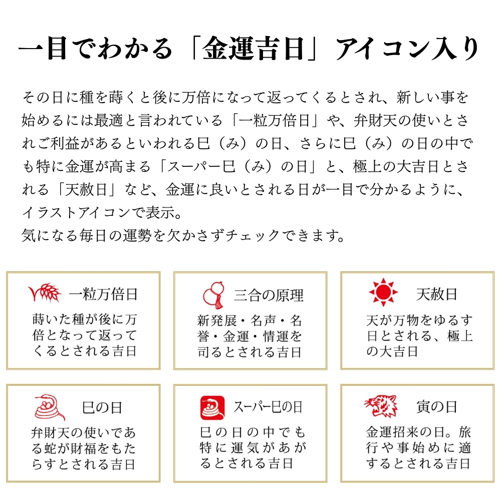 その日に種を蒔くと後に万倍になって返ってくるとされ、新しい事を始めるには最適と言われている「一粒万倍日」や、弁財天の使いとされご利益があるといわれる巳(み)の日、さらに巳(み)の日の中でも特に金運が高まる「スーパー巳(み)の日」と、極上の大吉日とされる「天赦日」など、金運に良いとされる日が一目で分かるように、イラストアイコンで表示。気になる毎日の運勢を欠かさずチェックできます。