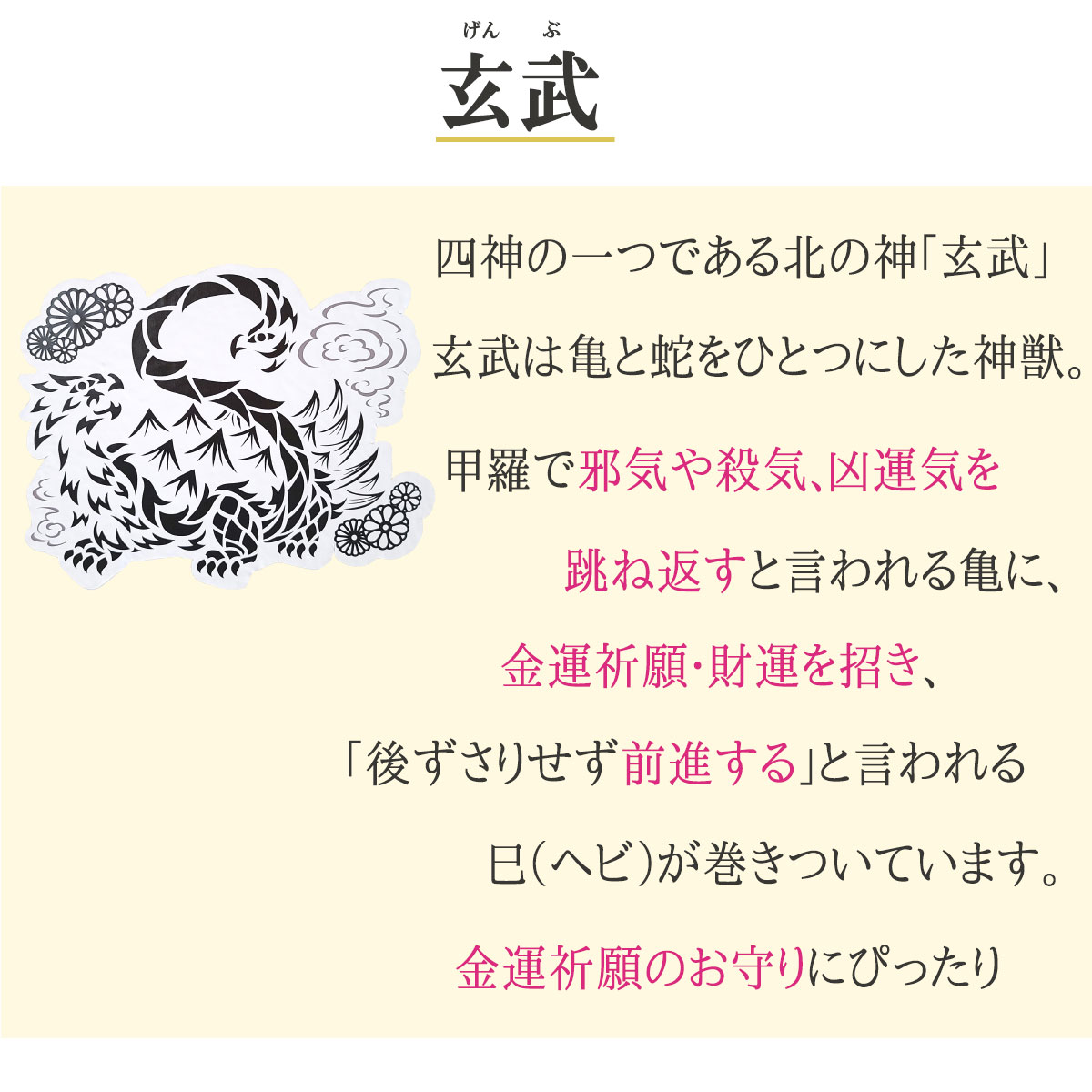 甲羅で邪気や殺気、凶運気を跳ね返すといわれる亀に、金運・財運祈願を招き、「後ずさりせず前進する」といわれれる巳(ヘビ)が巻きついています。