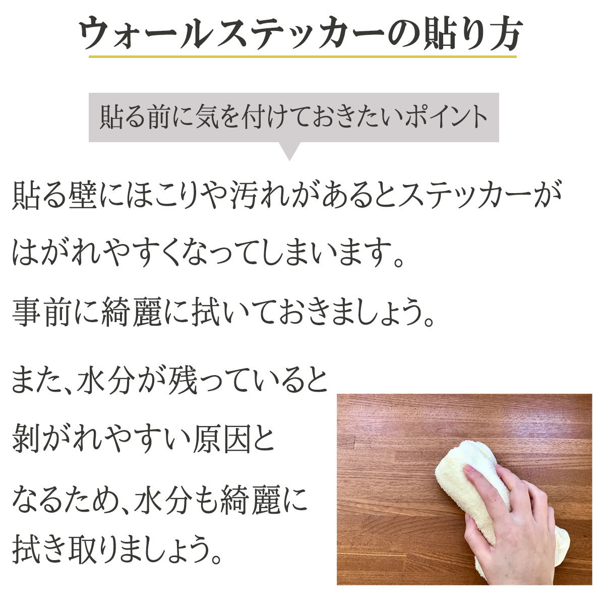 貼る壁にほこりや汚れがあるとステッカーがはがれやすくなってしまいます。