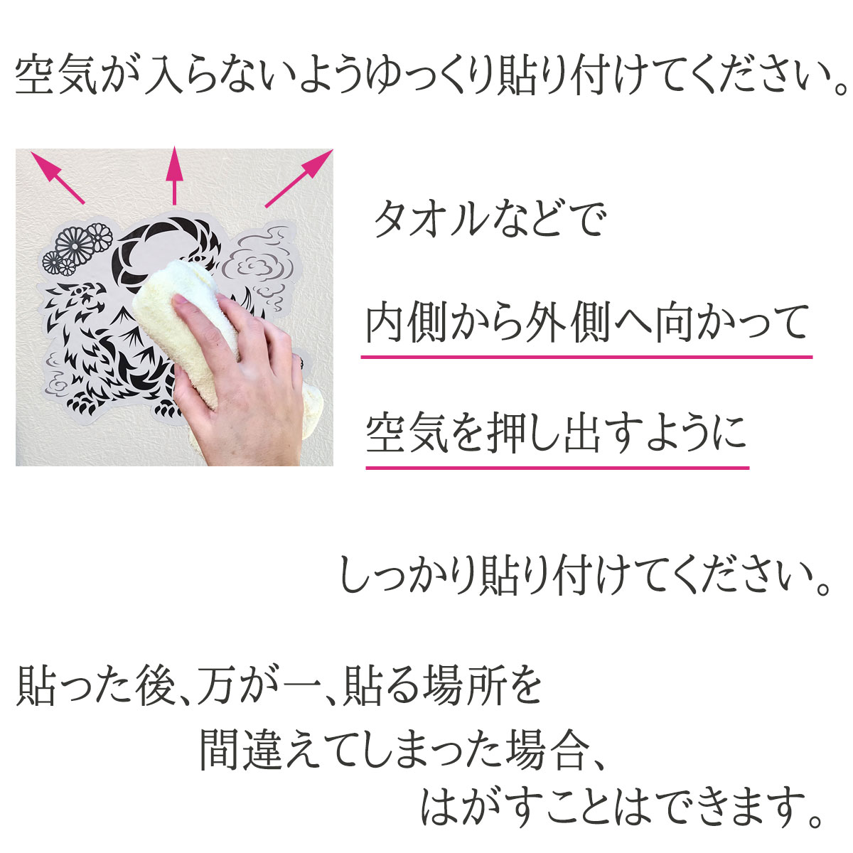 タオルなどで内側から外側へ向かって空気を押し出すようにしっかり貼り付けてください。